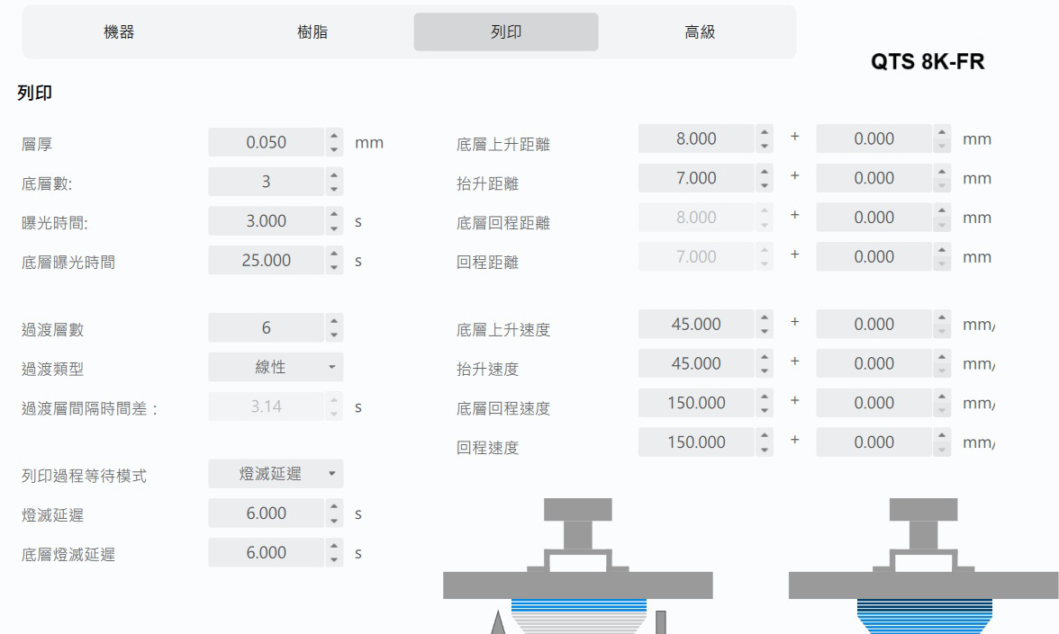*隨著3D列印機品牌差異,不同樹酯固化參數不同,以上僅為建議數值,實際列印參數請自行測試調整,以達最佳成型效果。