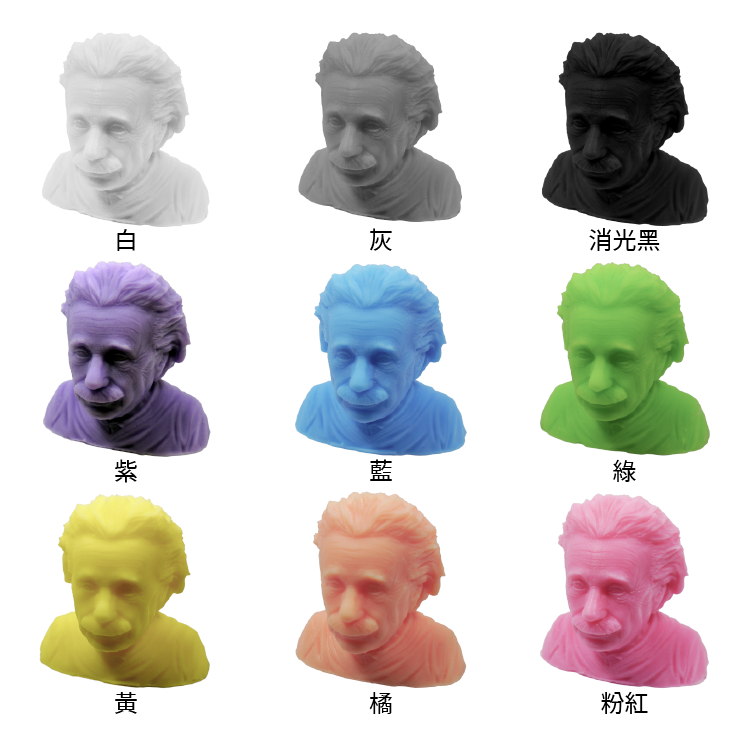 包含DLP、LCD、SLA 各式桌上型機種,此材料列印細節佳,固化時間短,堅固耐用且列印良率高,顏色豐富。