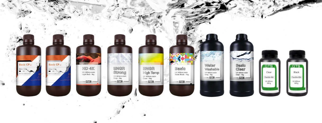 QTS光固化樹脂低刺激性、低臭味,顏色豐富,亦可客製。有基礎Basic、高韌性PPlike、柔韌且高延展Flex、水洗清潔的Water及高硬度Storng、耐高溫可達260度C的高溫樹脂等多款特性樹脂可供選購。