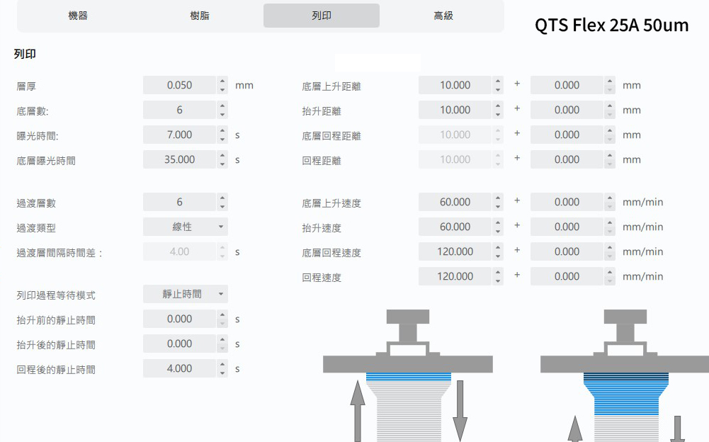 *隨著3D列印機品牌差異,不同樹酯固化參數不同,以上僅為建議數值,實際列印參數請自行測試調整,以達最佳成型效果。