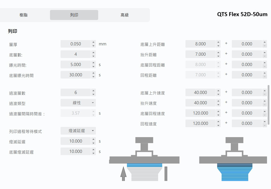 *隨著3D列印機品牌差異,不同樹酯固化參數不同,以上僅為建議數值,實際列印參數請自行測試調整,以達最佳成型效果。