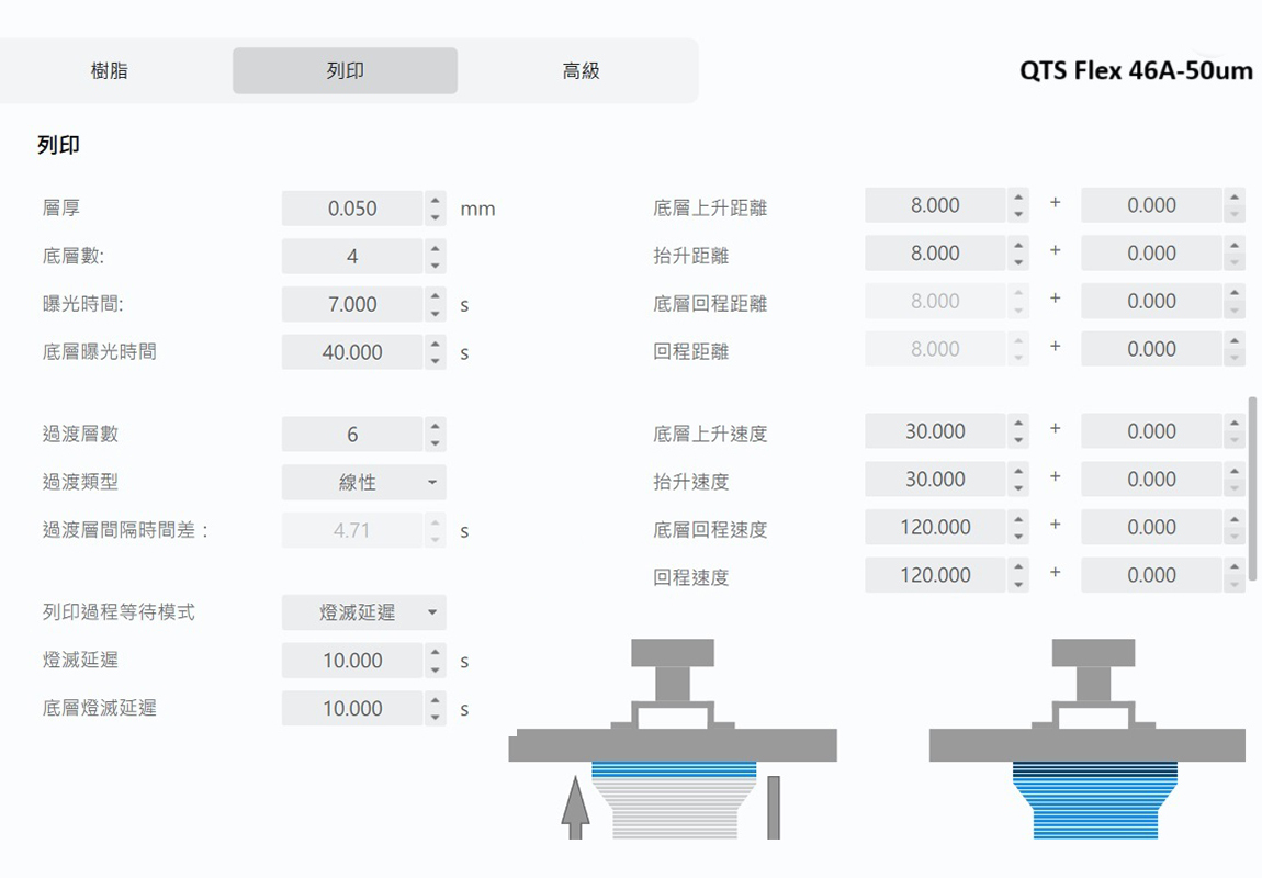*隨著3D列印機品牌差異,不同樹酯固化參數不同,以上僅為建議數值,實際列印參數請自行測試調整,以達最佳成型效果。
