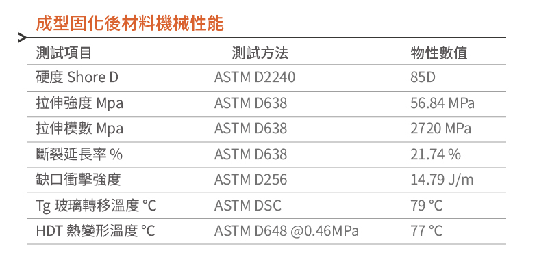 ◆ 成形物件經後固化處理,機械性能優異,不易破損。