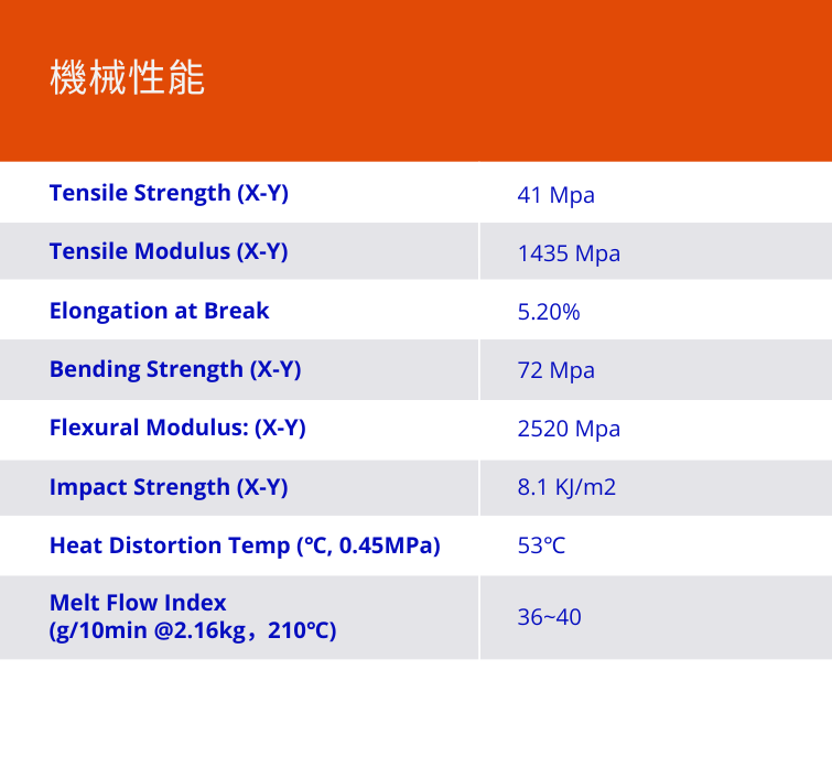 與ABS性質近、較ABS易控制翹曲、適合需要製作大面積物件,並要擁有ABS材料特性之應用 |