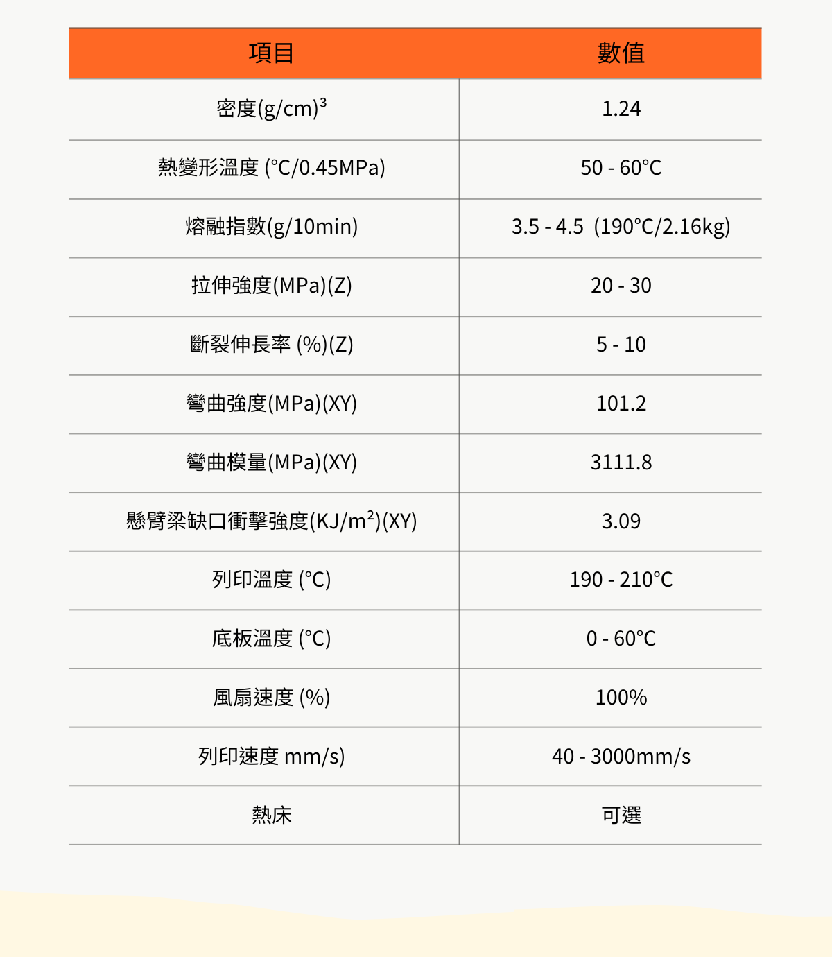 列印時易有翹曲,若成品未處理易有缺陷。部分成品存留氣味 |