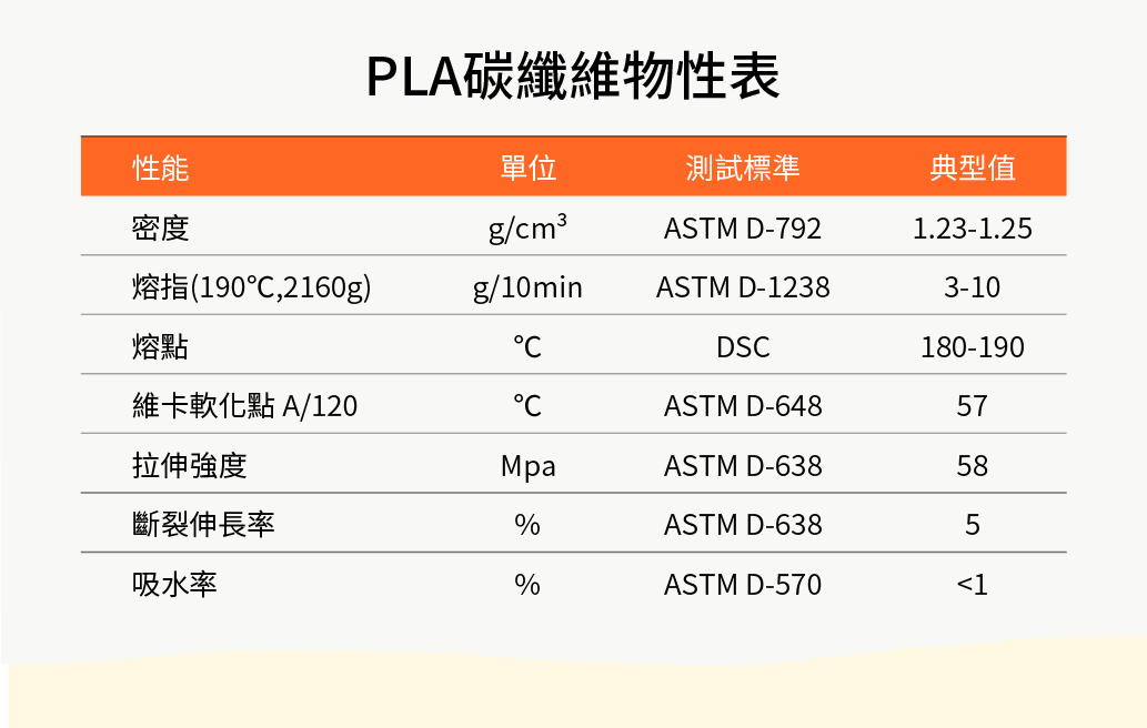 與ABS性質近、較ABS易控制翹曲、適合需要製作大面積物件,並要擁有ABS材料特性之應用 |