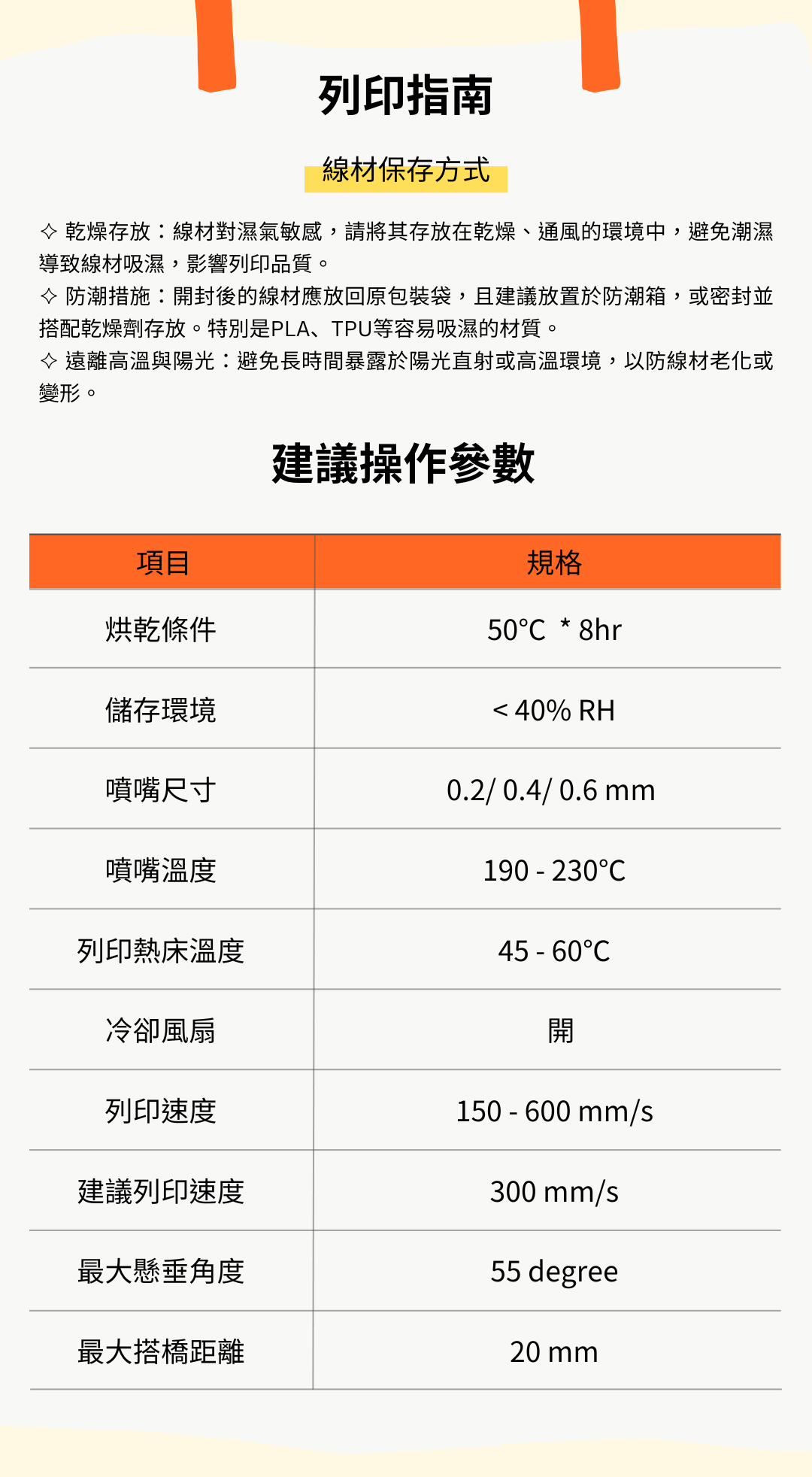 ◆ 此材料使用真空包裝、未使用前不要拆開包裝袋,以免吸潮,過度吸潮將會嚴重影響 3D 列印品質。