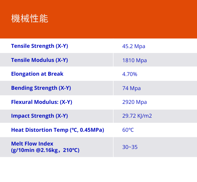 列印時易有翹曲,若成品未處理易有缺陷。部分成品存留氣味 |