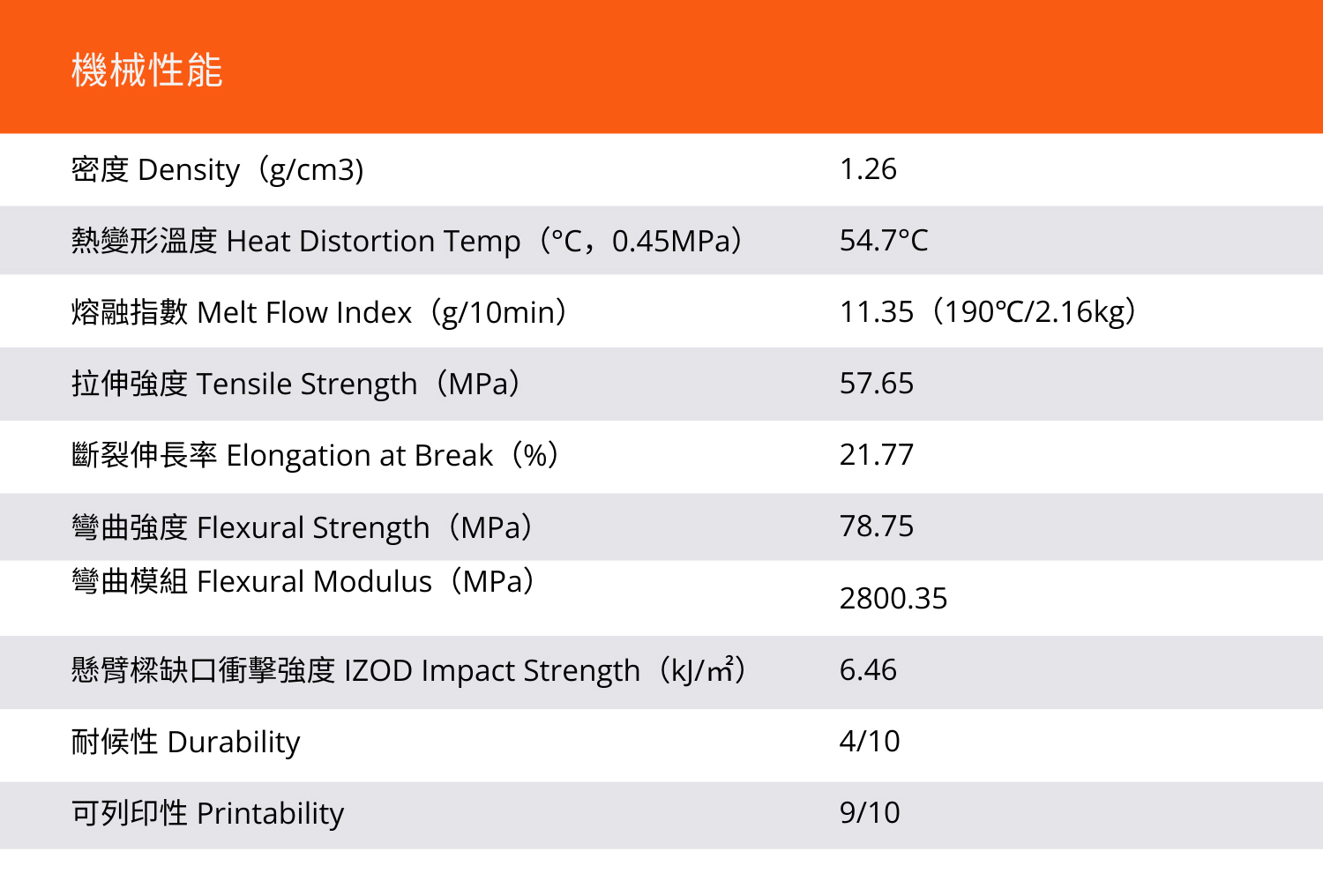 與ABS性質近、較ABS易控制翹曲、適合需要製作大面積物件,並要擁有ABS材料特性之應用 |