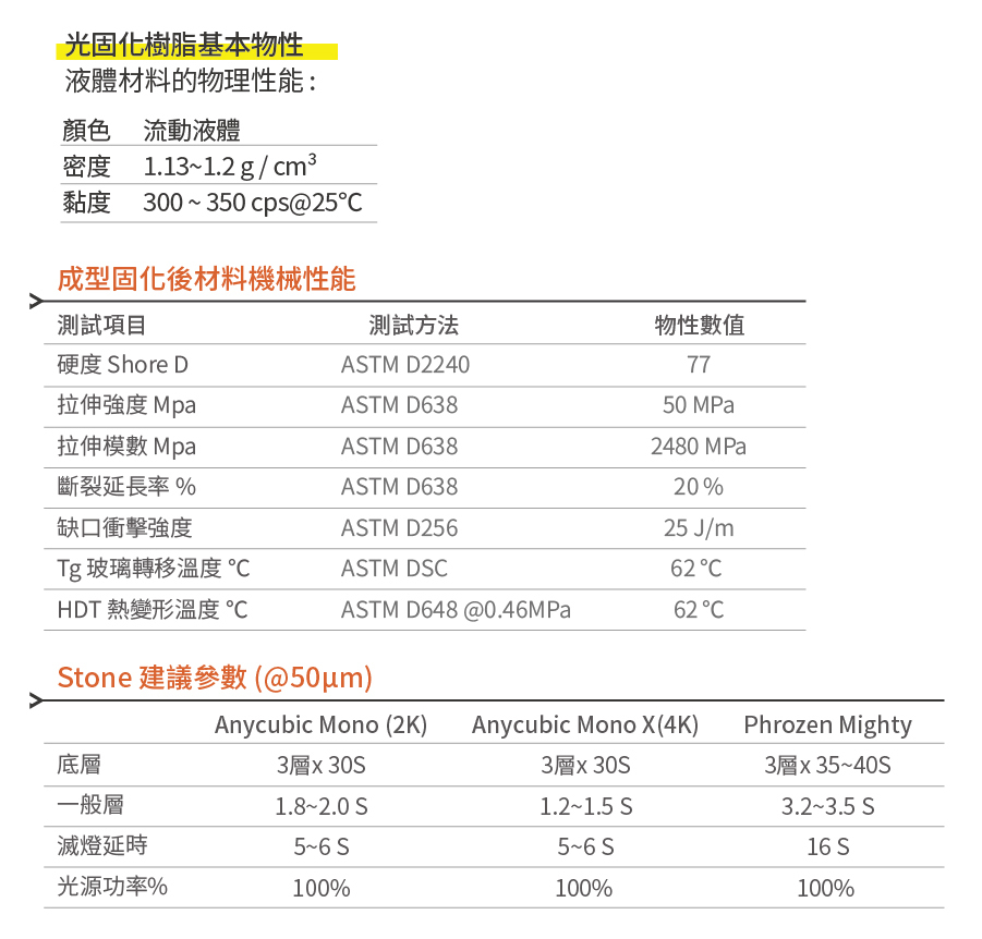 STONE 仿石材樹脂是一種液體紫外光固化的光敏樹脂,其適用於使用波長 395~405nm 的 3D 成型設備,包含 DLP、LCD、SLA 各式桌上機種,在正常列印操作下 ,此材料即可呈現天然石材般的紋理,適合列印石雕、兵馬俑等工藝品。