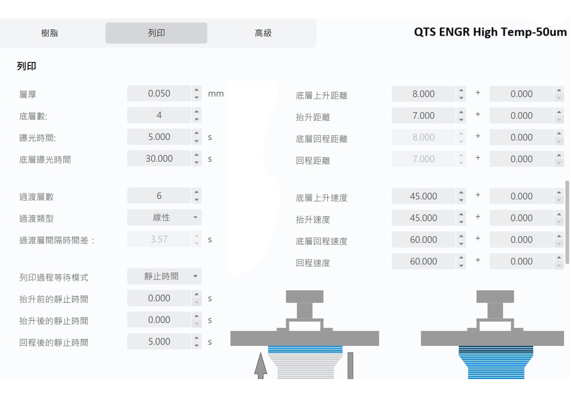 *隨著3D列印機品牌差異,不同樹酯固化參數不同,以上僅為建議數值,實際列印參數請自行測試調整,以達最佳成型效果。