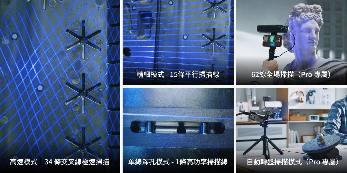 先進藍光雷射陣列支援「交叉線」、「平行線」及「單線雷射 3D 掃描」,