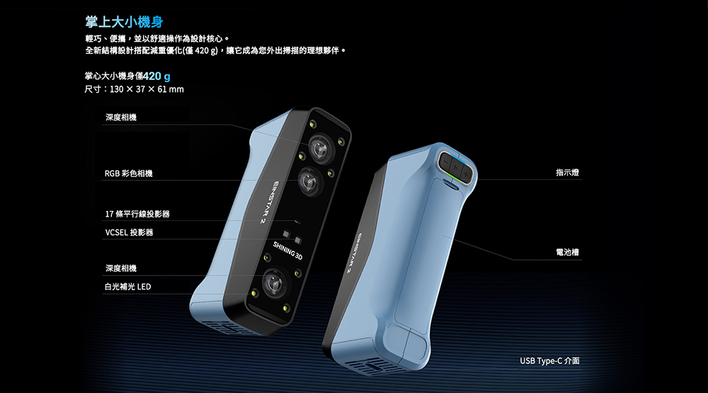 EINSTAR 2 延續經典優勢全面升級,重新定義手持式 3D 掃描體驗。告別繁瑣的線材束縛與複雜的前置設定,真正實現自由移動、隨拿即掃的高效率工作流程。