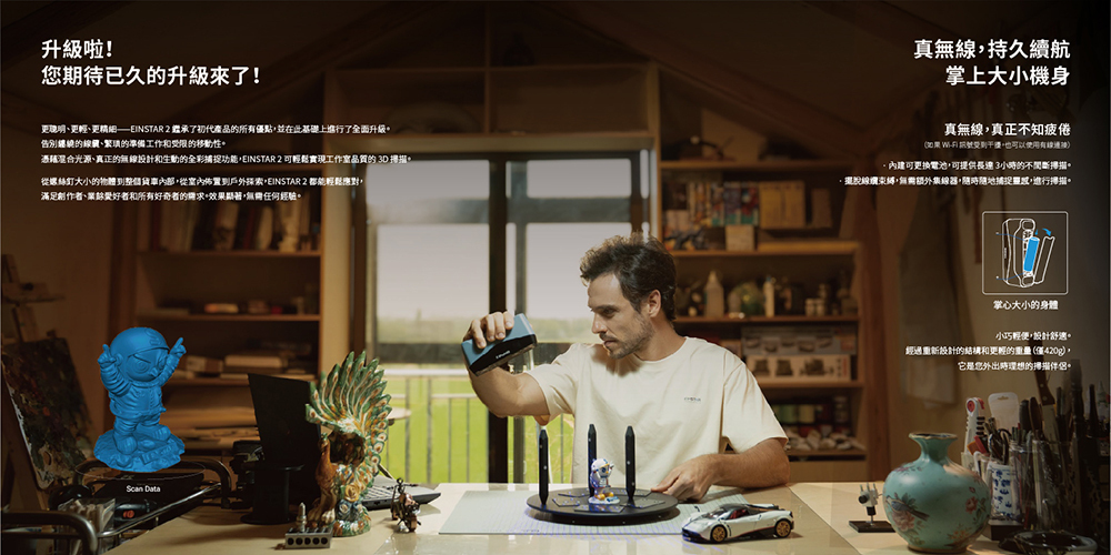 搭載混合光源技術、完整無線設計與高品質全彩捕捉能力,EINSTAR 2 能輕鬆呈現細節與色彩,帶來接近工作室等級的 3D 掃描成果。