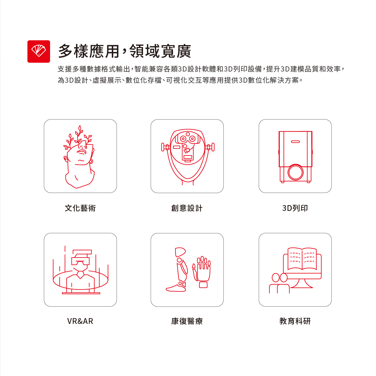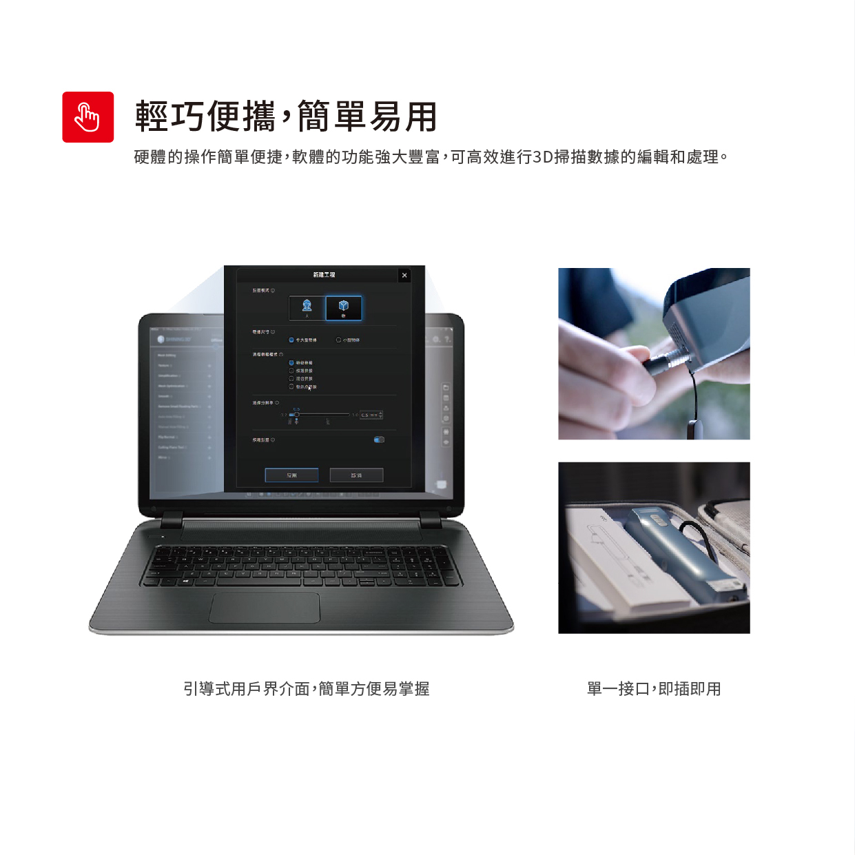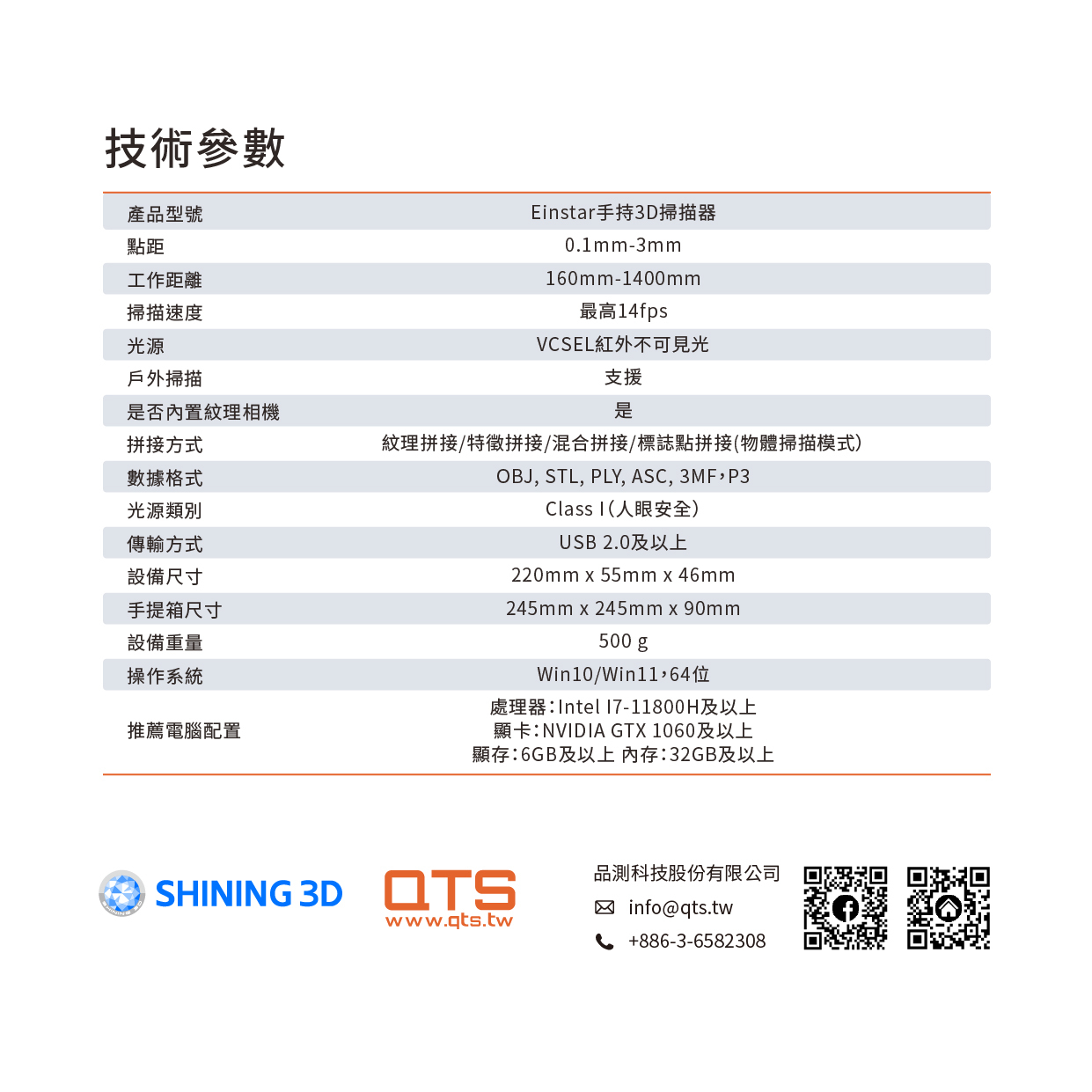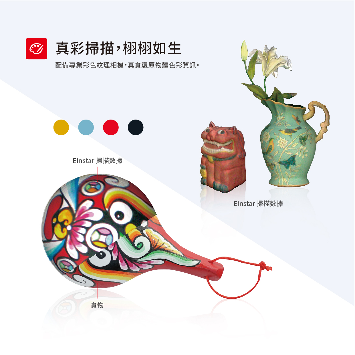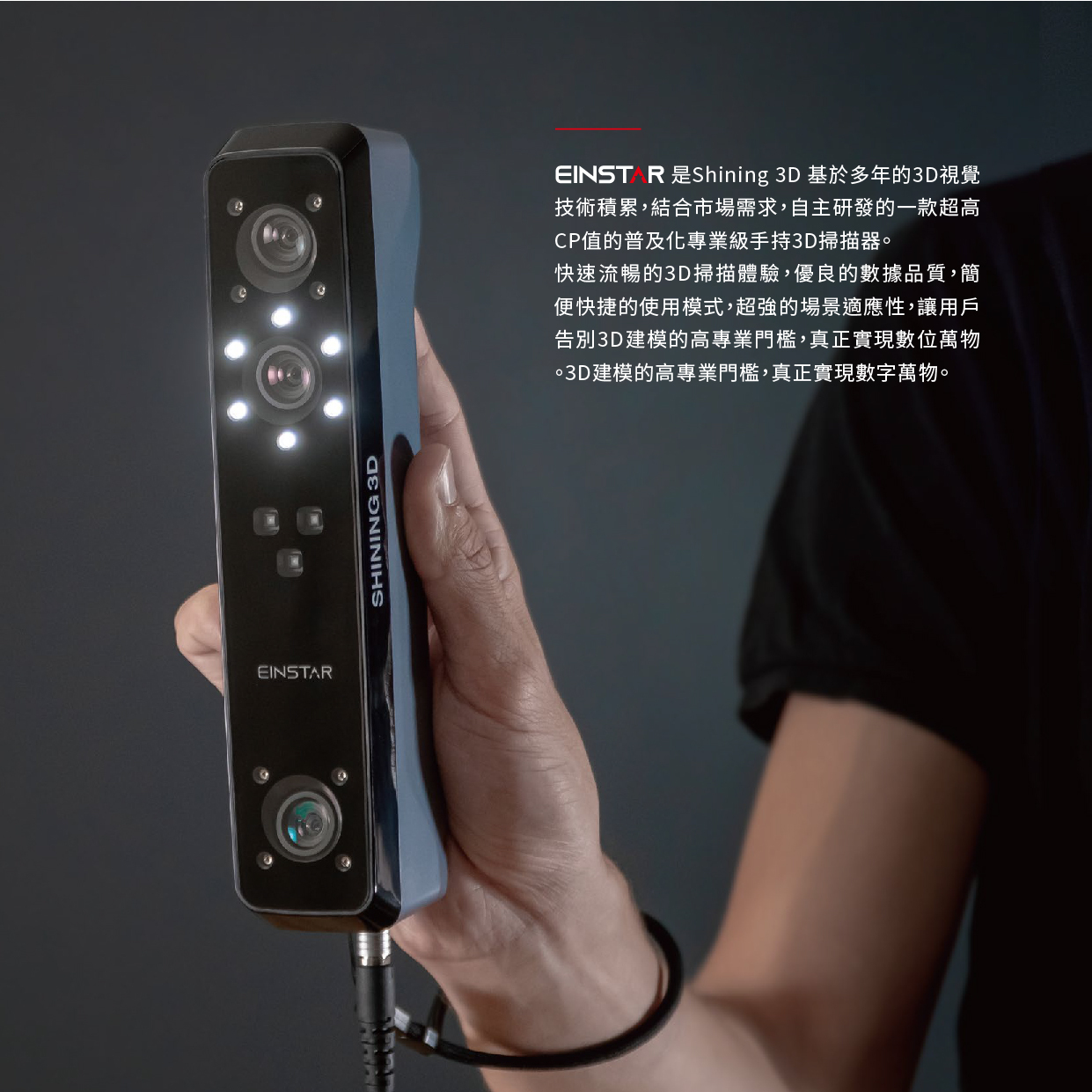 EinStar 手持式3D全彩超高速掃描器匯集眾多高級軟體功能,顛覆市場的超高CP值、大掃描範圍,掃描中大型物件不再卡卡,可以幫助您輕鬆獲取3D數據,包括 3D列印微縮模型、數位典藏、簡易逆向工程等,絕對是入手3D掃描的絕佳設備!