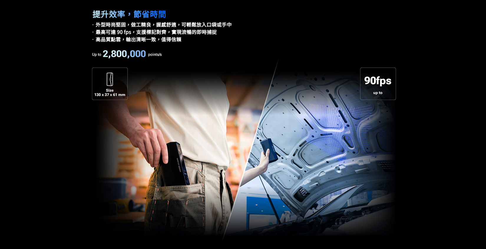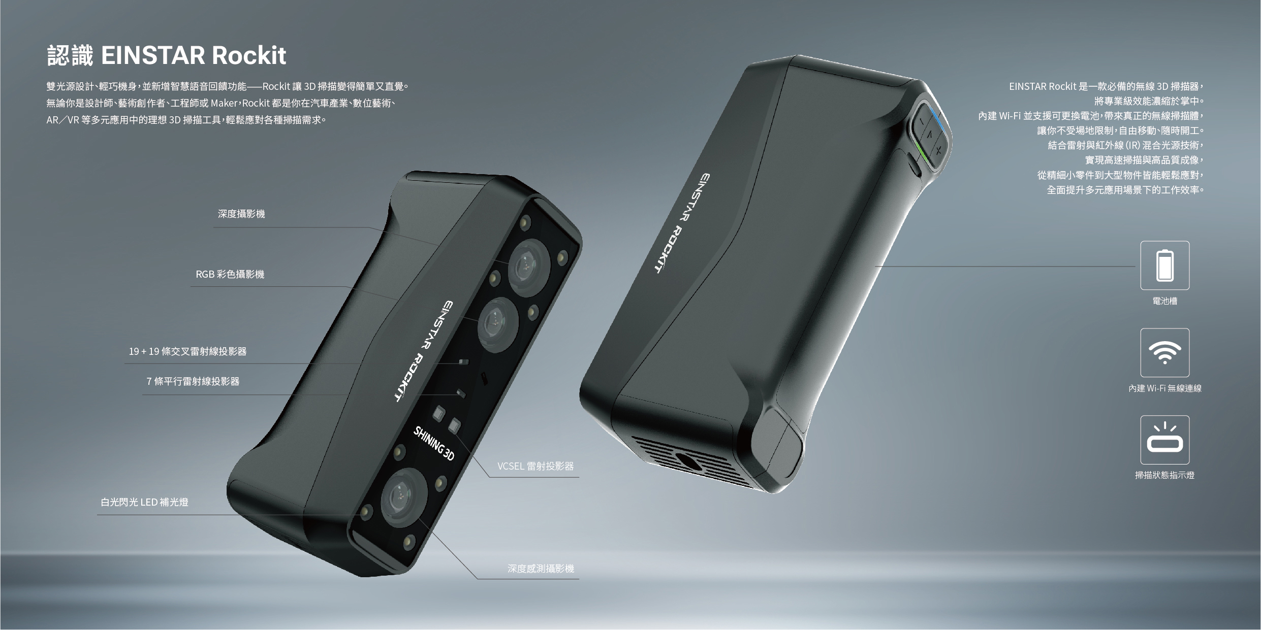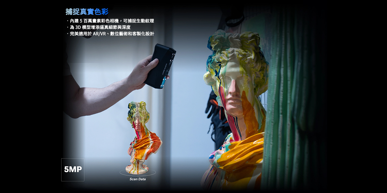 雙光源設計、輕巧機身,並新增智慧語音回饋功能——Rockit 讓 3D 掃描變得簡單又直覺。無論你是設計師、藝術創作者、工程師或 Maker,Rockit 都是你在汽車產業、數位藝術、AR/VR 等多元應用中的理想 3D 掃描工具,輕鬆應對各種掃描需求。