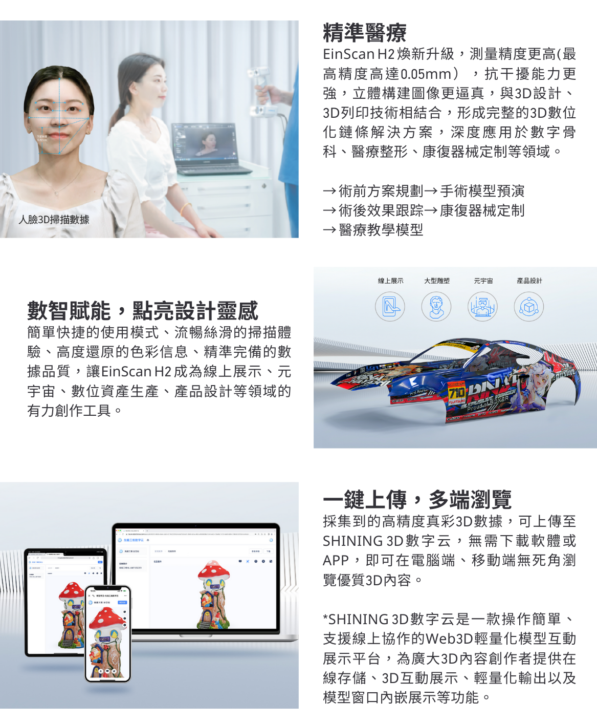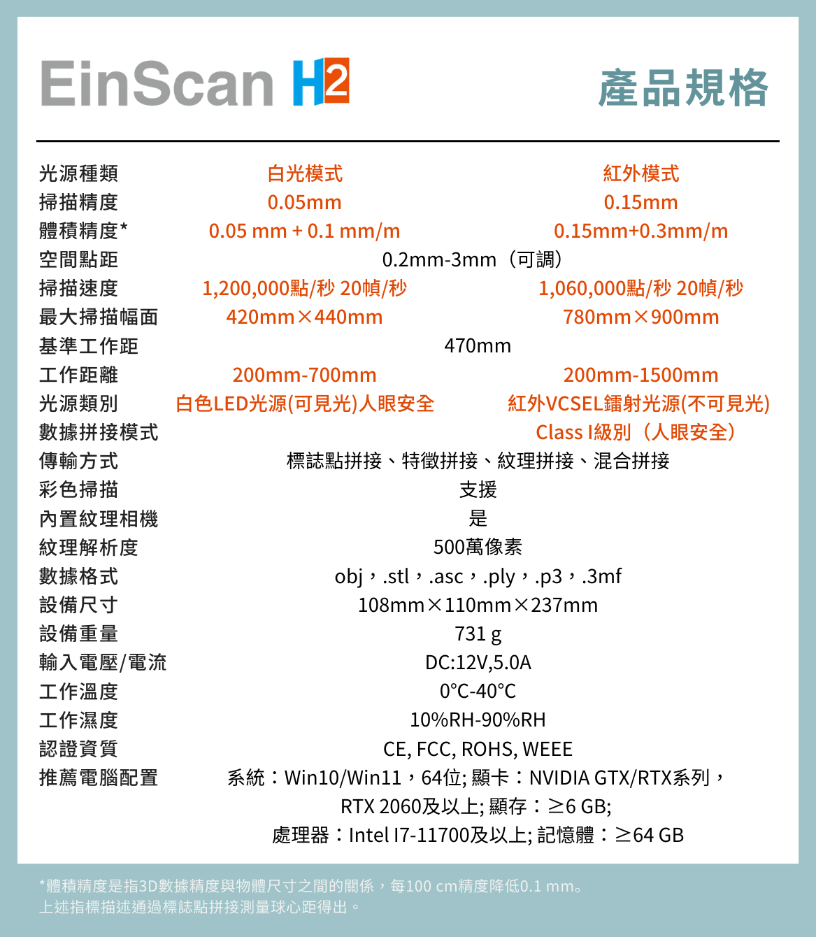 EINSCAN H2雙光源手持彩色3D掃描器,是SHINING 3D基於前代產品精心升級打造的一款專業級3D掃描器。採用LED白光和紅外VCSEL雷射兩種光源,兼顧細節與效率,可適應多種掃描場景需求。