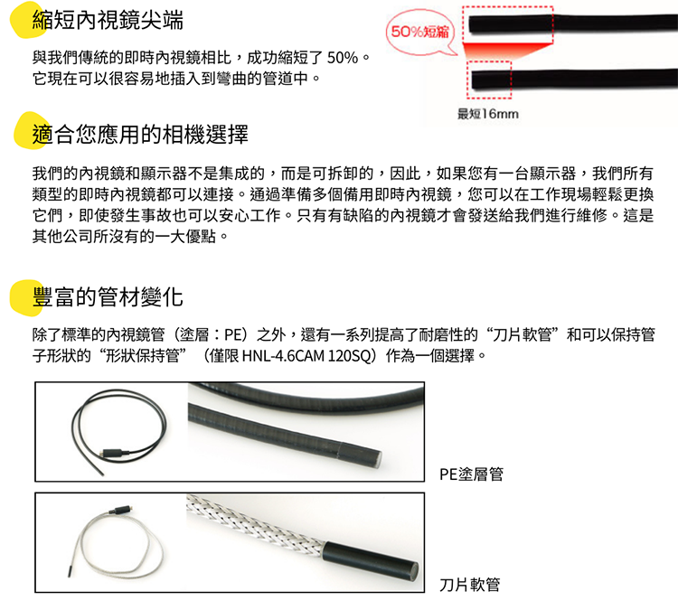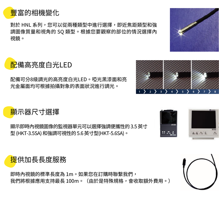 我們的通用工業內視鏡 HNL 系列是一種工業內視鏡,其精細度和功能可與傳統纖維鏡相媲美,可用於觀察狹窄空間。您可以從兩種類型的功能中進行選擇,短距離和遠距離對焦,以及強調圖像質量和視角的 SQ 類型。我們將自己的工業內視鏡稱為“即時內視鏡”,我們提供了易於使用及簡單功能的工業內視鏡。與光纖式內視鏡不同,SPI內視鏡具有如下結構:在內視鏡的尖端處設置有使用成像傳感器的超小型相機,並且與一些工業內視鏡鏡和照胃像機也具有相同的結構。
