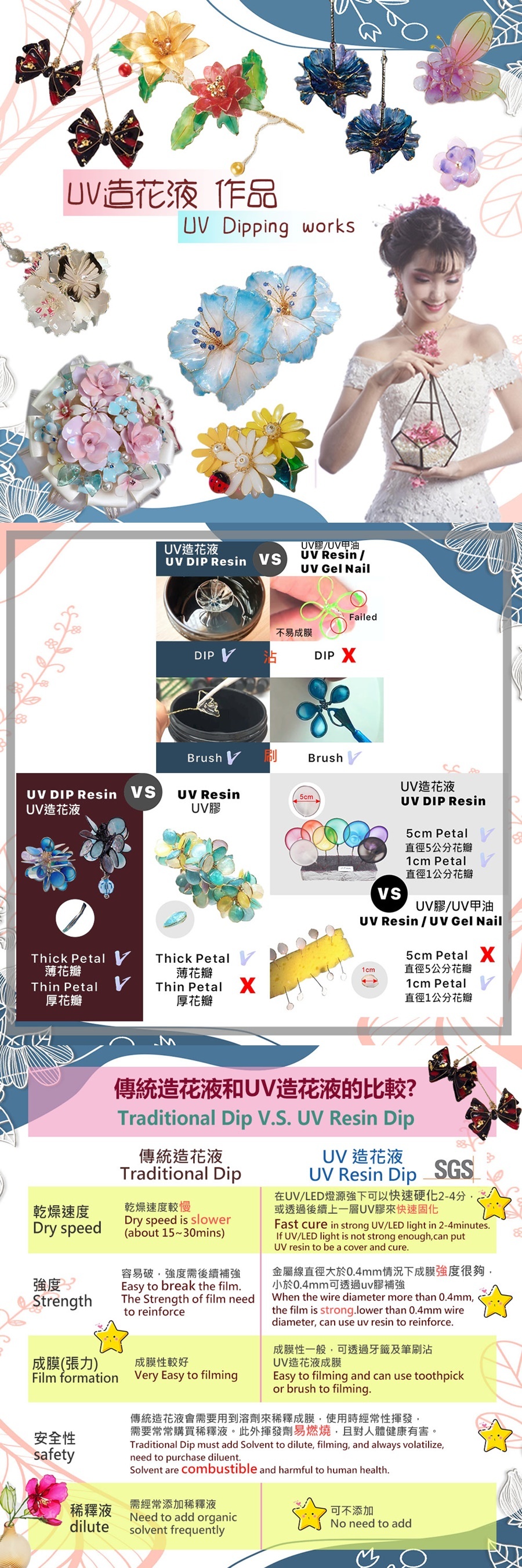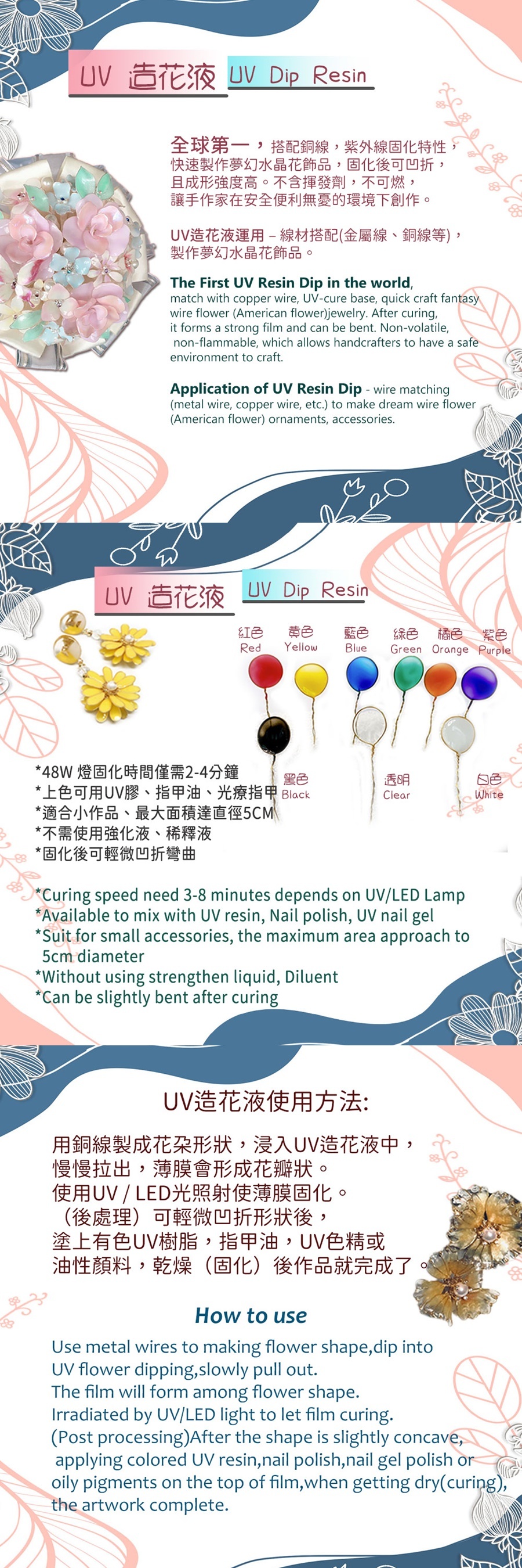 UV造花液,市面上唯一光固化的水晶花造花液,UV LED美甲燈照射僅需2分鐘,成品表面閃亮光滑,可輕微凹折。