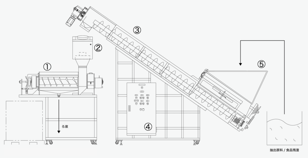安裝了一個大型料斗(5),以便快速送入餐廚垃圾和其他物料,並安裝了螺旋輸送機(3),以便將定量物料輸送到螺旋壓榨脫水機(1)。