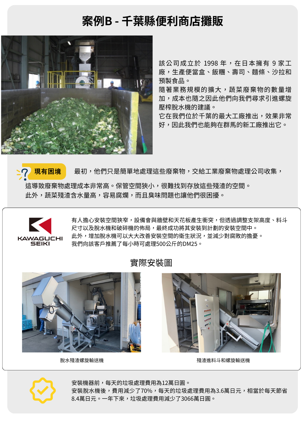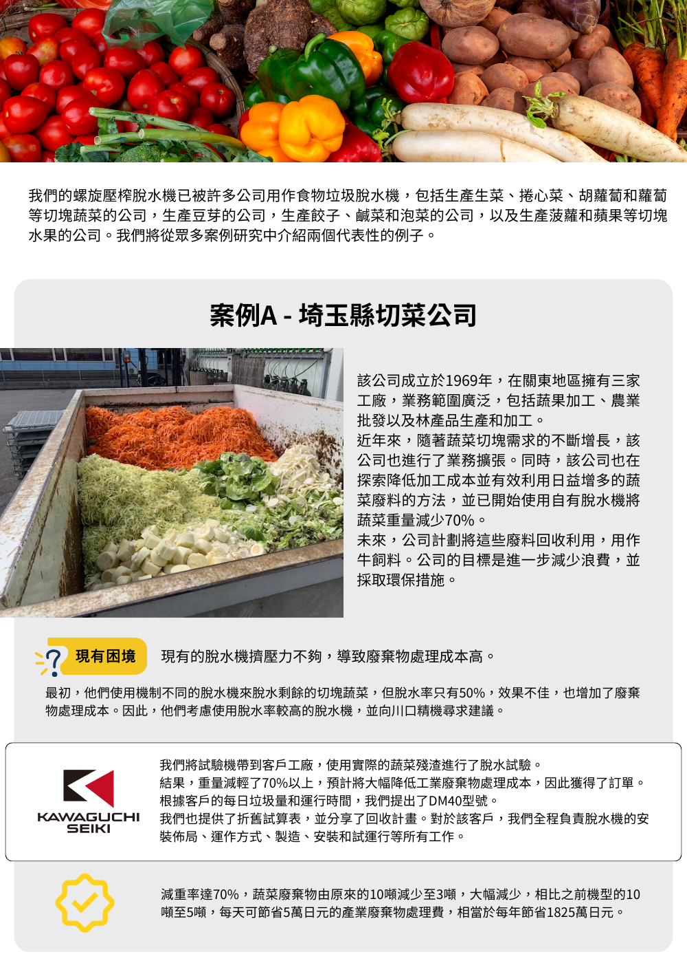 川口精機株式会社創立於1949年,專注螺旋壓榨式脫水機研發製造,應用於食品、飲料、醫藥等領域。其產品以楔形線濾網設計提升脫水效率,適合處理蔬果與豆芽等高含水副產品,並可整合粉碎、輸送系統。公司同時推動「Eco-Feed」方案,將殘渣再利用為飼料,兼顧產能與環境永續。