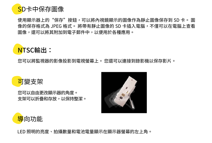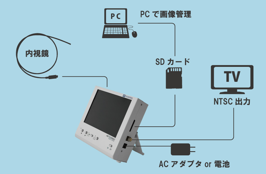 顯示器標配圖像保存功能,您可以使用內窺鏡在現場立即保存和檢查圖像。圖像存儲格式為JPEG格式。由於它保存在 SD 卡上,因此可以在個人計算機上進行管理。您拍攝的圖像可用於各種目的。