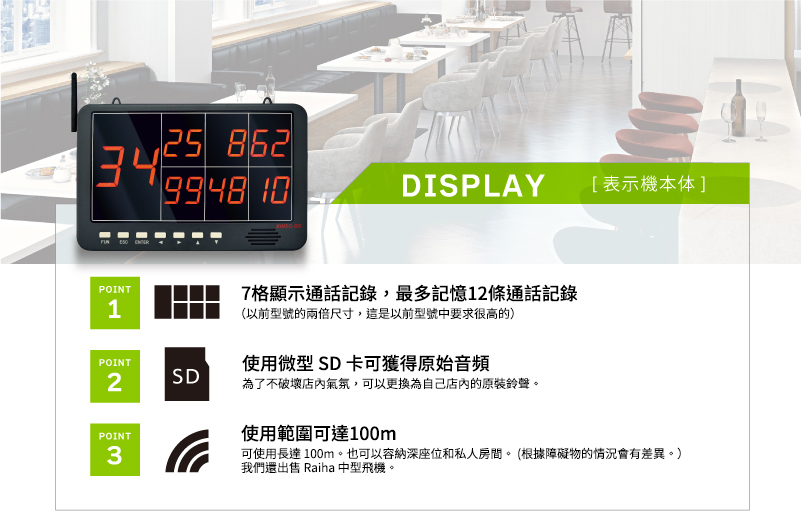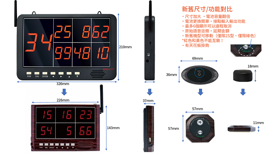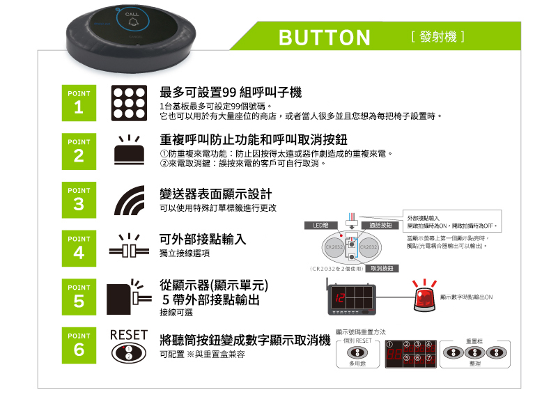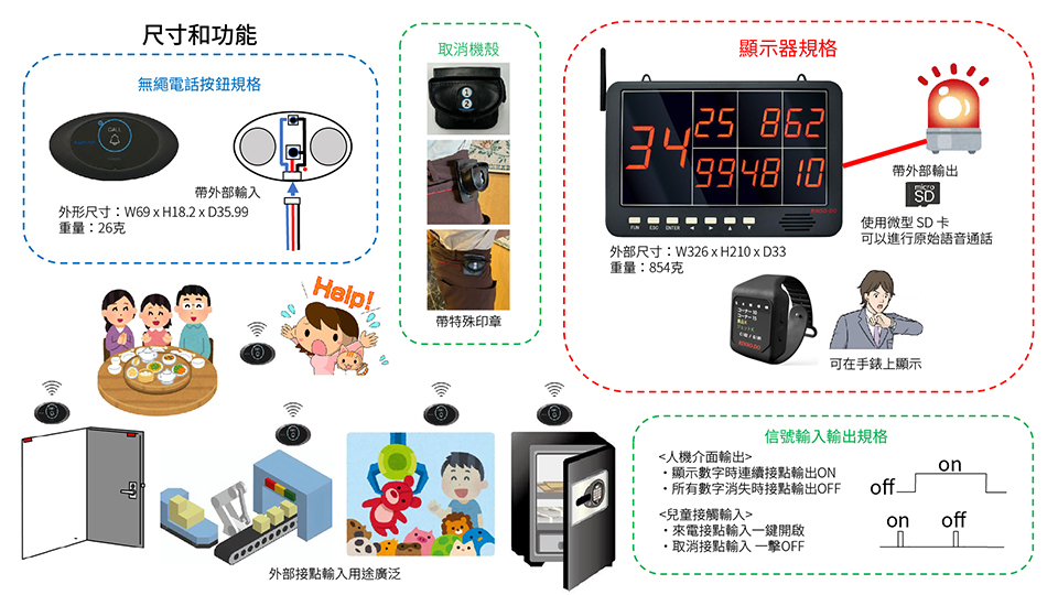產品特色: ・ 壓倒性低價格產品 ・ 日本設計開發 ・ 免安裝省去人力費用 ・ 使用方法超簡單 ・ 無線傳輸免配線 ・ 傳輸距離可達100M ・ 業界首創子機可取消功能 (採用此種方式服務人員可直接在客戶旁將服 務鈴取消,大大的節省了以往到主機才能 取消的時間 ) ・ 主機價格低容易擴充 連續呼叫可依照順序排列 ・ 單主機最多可搭配 99 組呼叫子機 |