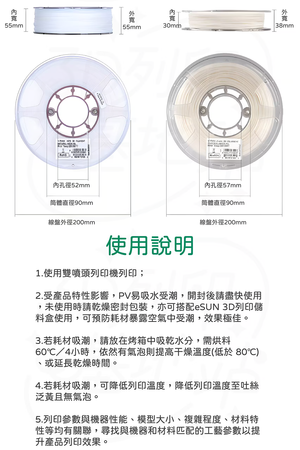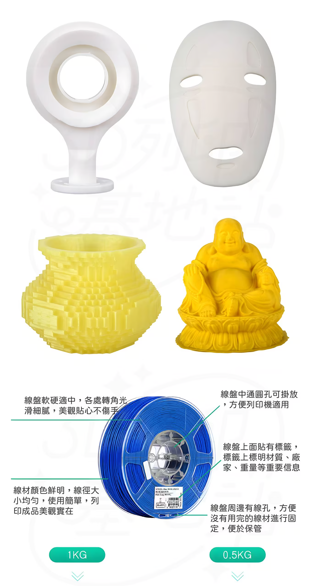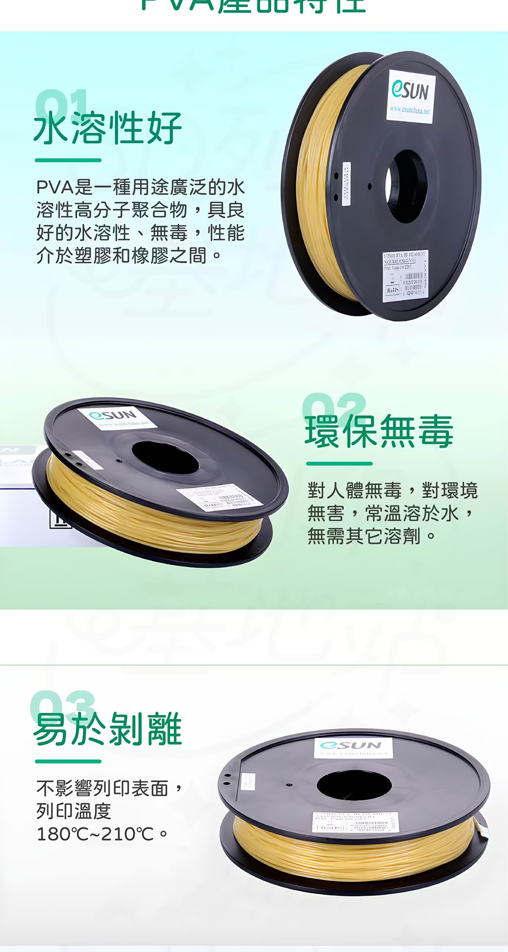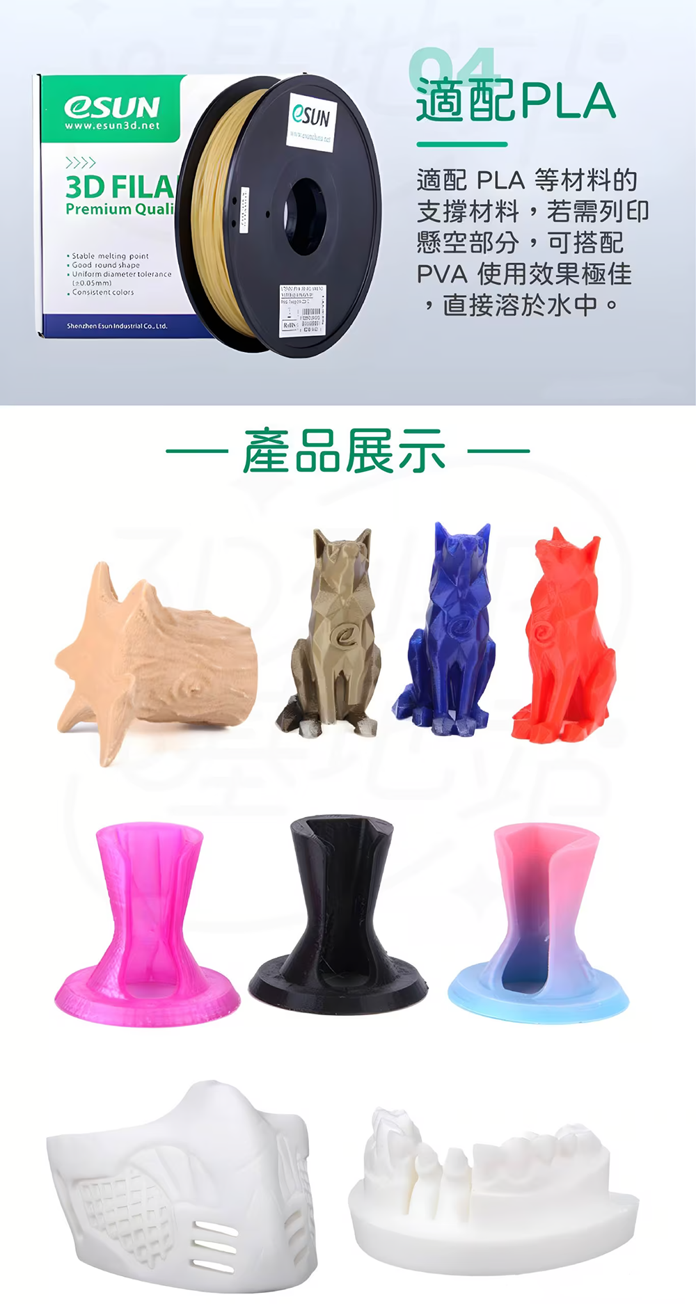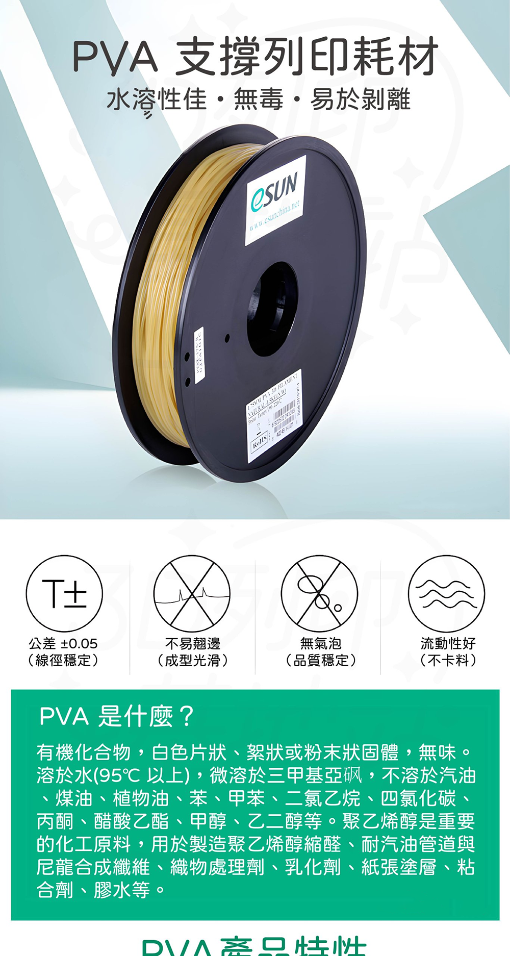 PVA是具有良好水溶性的3D列印耗材,無需特殊溶劑與硬件,熱水中可加快溶解,溶解後模型表面不會有殘留物,接觸面表面光滑平整;可用於PLA、TPU、PA等耗材列印極其複雜的形狀或具有部分封閉腔的形狀的支撐材料;適用於多噴嘴列印機。