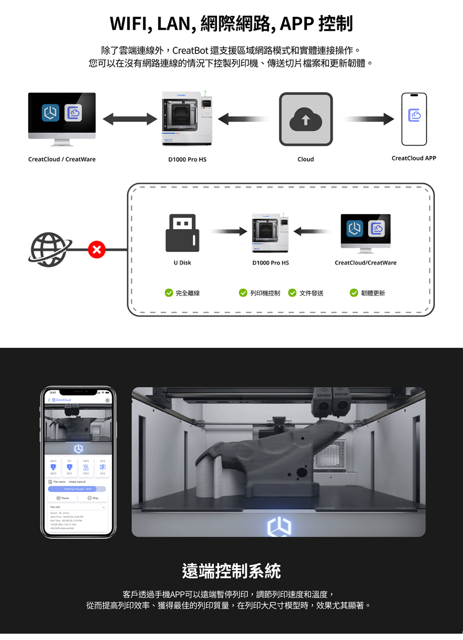 .支援 PLA、ABS、PC、尼龍、TPU、碳纖/玻纖強化材料(如 PA-CF、PC-CF 等)等多種耗材。